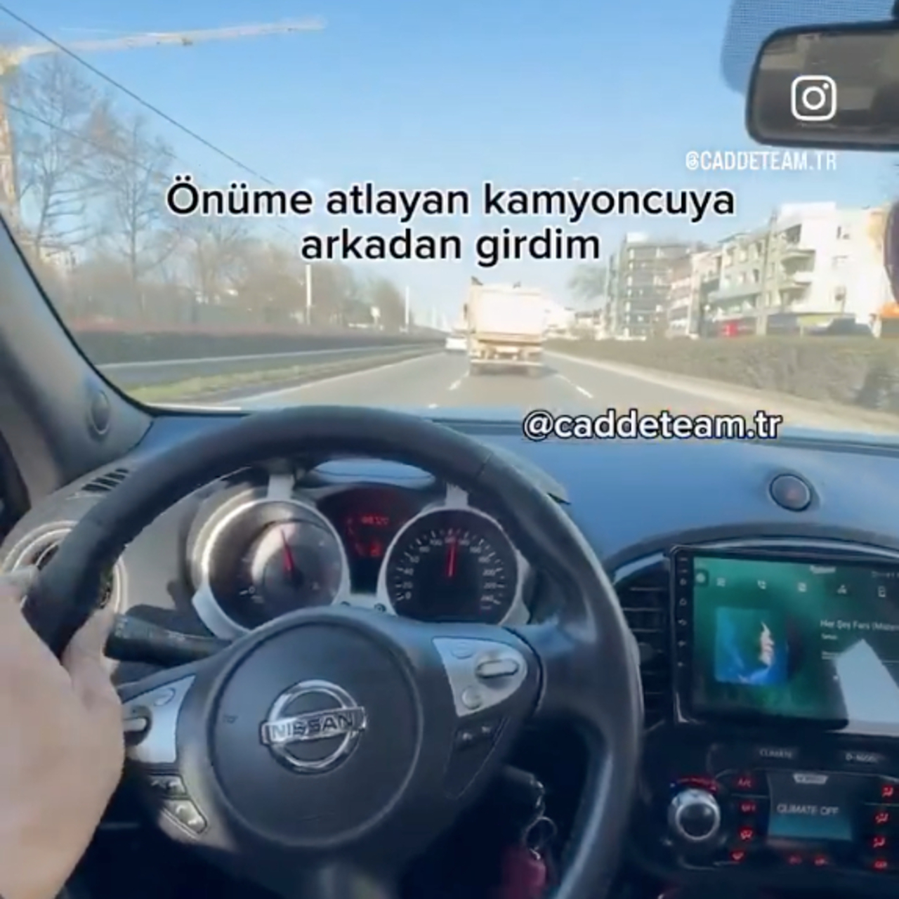 Bir otomobilin içinden çekilen görüntülerde, araç sinyal vermeden hızla şerit değiştirirken başka bir kamyona çarptı. Kazada kimsenin ölmemesi tesadüf olarak nitelendirildi.